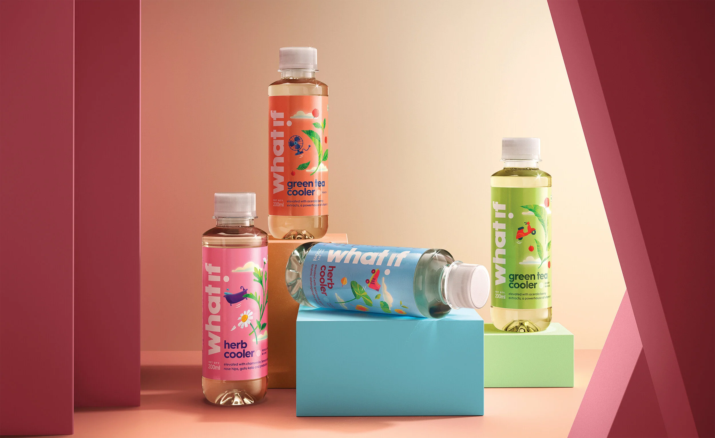 We were approached by Sipwise Beverages to develop the launch visuals for What If, a range of herb and tea coolers. The job was to develop the product CGI images and also develop the look for a range shot.